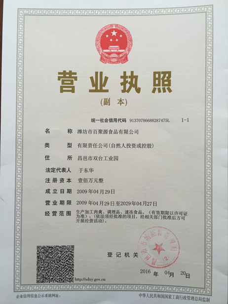 濰坊市百聚源食品有限公司成立于2009年7月份,現(xiàn)位于山東省昌邑市雙臺工業(yè)園。本公司是一家專業(yè)研究、開發(fā)、生產及銷售調理食品的企業(yè),主要產品面向全國市場,主要市場有北京、上海、福建、江蘇、廣東、湖北等大型城市的學校、中級西式餐廳、大中型商超及行政事業(yè)單位及企業(yè)的配餐供應。公司引進了國內的生產技術和設備,年深化加工能力10000噸肉禽產品,將禽肉產品調理深化加工后,成為可以直接面對消費者的高端產品。產品在國內食品行業(yè)內具有較高水平。公司于2009年取得全國工業(yè)產品生產許可證,于同年取得清真食品生產經營資格。于2011年五月份被昌邑市政府評為“2010年度食品安全生產先進經營單位”。2018年被市政府評為“昌邑市標桿企業(yè)”